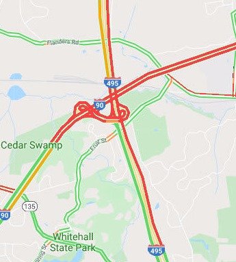 The intersection of I‑495 and I‑90 in Westborough frequently sees congestion, not only on the on and off ramps, but often on the surrounding roadways as well.